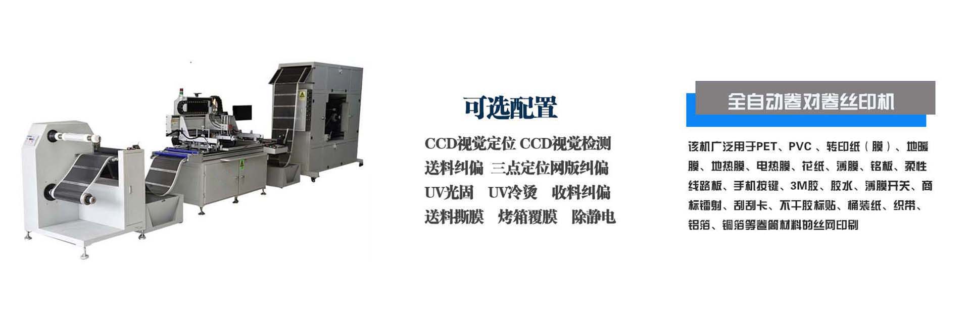 我司主要生產全自動絲印機,全自動卷對卷絲印機,全自動薄膜開關絲印機,全自動熱轉印膜絲印機,全自動無紡布絲印機,全自動電熱膜絲印機,全自動電路板絲印機,卷料商標標簽絲印機,電熱膜凹印機,涂布機,全自動切片機.imd設備,imd熱壓成型機,數控3D沖切機,鋰電池卷繞機,電熱膜覆合機,覆膜機,倒卷機,簡易分條機,打孔機等設備